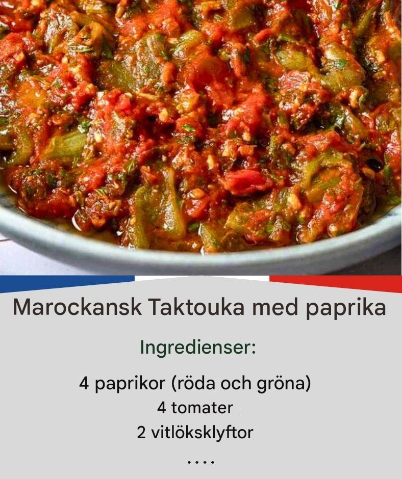 Taktouka Àr en smakrik marockansk sallad gjord pÄ rostade paprikor och tomater, kryddad med milda kryddor. Detta recept, perfekt som förrÀtt eller tillbehör, Àr lÀtt att tillaga och sprudlar av smak. Det Àr en frÀsch och fÀrgglad rÀtt som ger en exotisk touch till ditt bord.