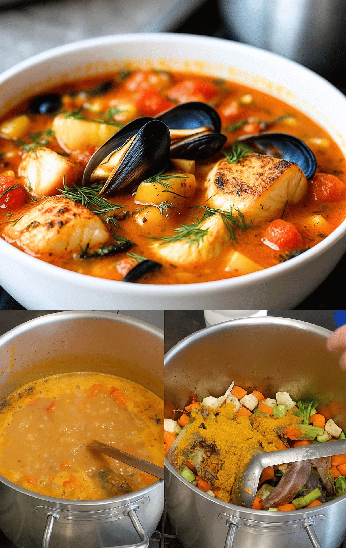 - 2,5 till 3 kg olika fiskar och skaldjur (skorpionfisk, gurnard, havsål, marulk, torsk, musslor, räkor, havskräftor etc.)