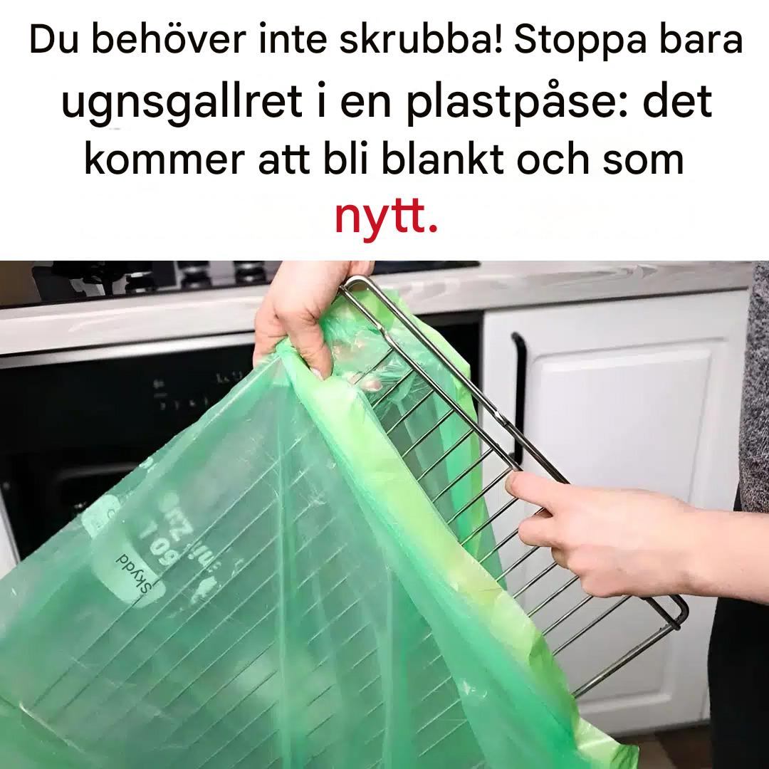Älskar du att laga läckra måltider, men din ugn får ta överhanden? Såsstänk, smält ost, fastbränt fett… Gallret blir snabbt en mardröm att rengöra. Och låt oss vara ärliga: att skrubba det för hand är inte kul. Innan du använder de naturliga starka kemikalierna, prova detta och ekonomiska gammaldags knep: en enkel plastpåse, lite bikarbonat… och ditt galleri kommer att se helt nytt ut, utan ansträngning!