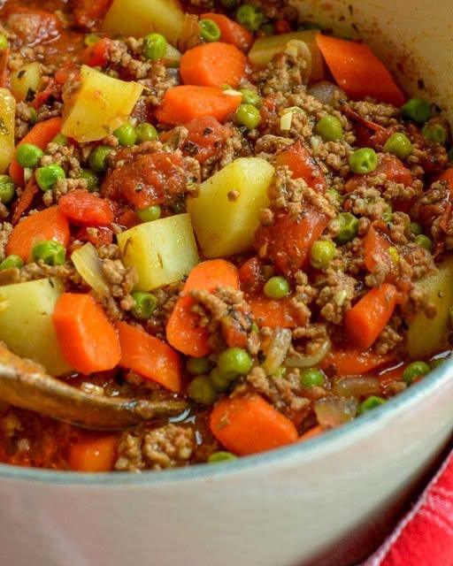 Denna rejäla och smakrika gryta kombinerar nötfärs med en blandning av klassiska grönsaker, allt sjudet i en tomat- och nötbuljong smaksatt med aromatiska örter.