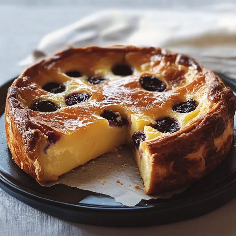 Denna enkla men eleganta dessert liknar en korsning mellan flan och clafoutis, kännetecknad av sin mjuka, krämiga konsistens och den söta smaken av macererade plommon.