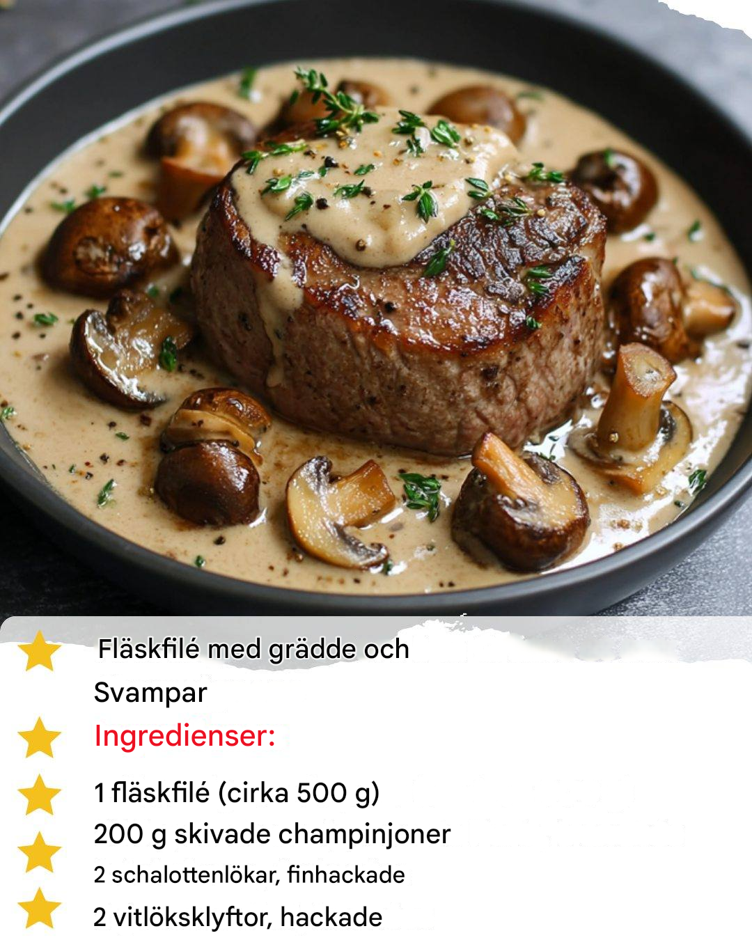 Instruktioner: Hur man tillagar detta recept på fläskfilé med grädde och champinjoner?