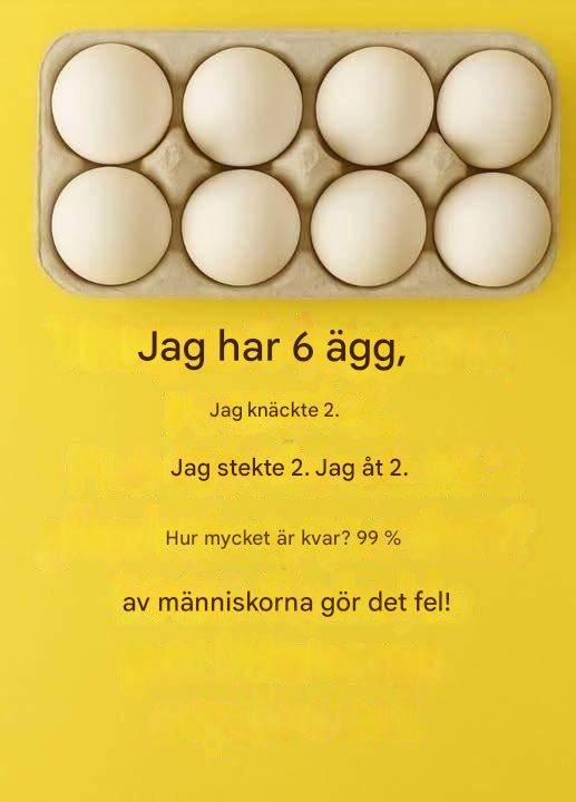 “Jag har 6 ägg. Jag knäckte 2. Jag stekte 2. Jag åt 2. Hur många ägg har jag kvar?”