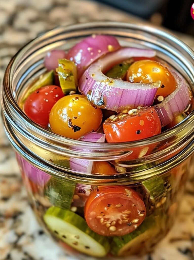 Dessa inlagda körsbärstomater , rödlök och gurka är ett läckert och mångsidigt tillbehör som kan avnjutas till en mängd olika måltider. De ljusa färgerna och den syrliga smaken gör dem till ett perfekt tillbehör till grillat kött, sallader eller smörgåsar.