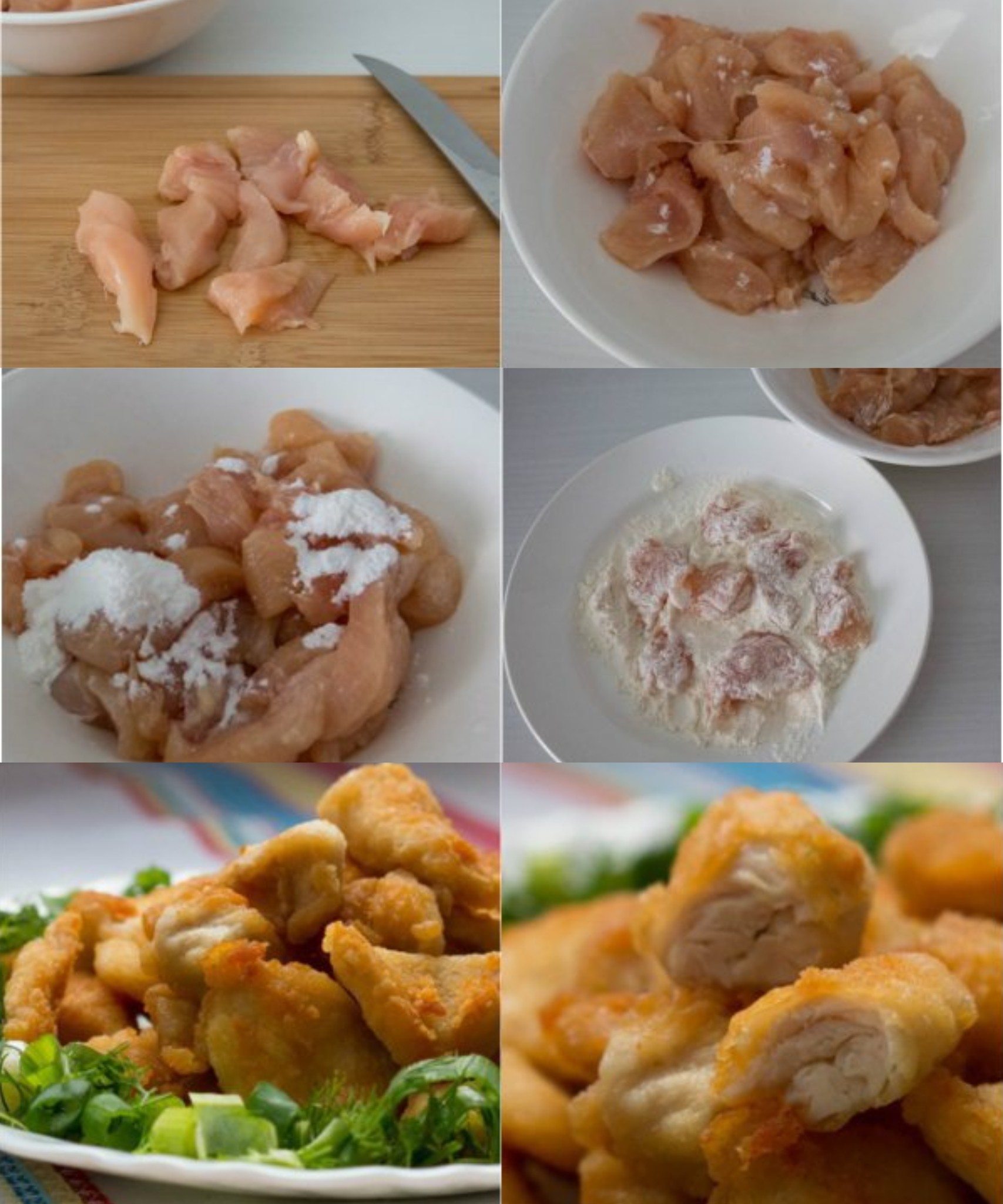 🧂 Huvudingredienser: kycklingbröst, majsstärkelse, bikarbonat, citronsaft, salt, mjöl och vegetabilisk olja för stekning.