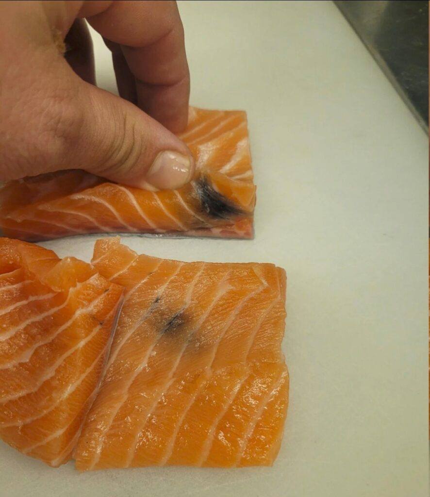 Den vanligaste orsaken till en gul eller blek missfärgning på lax är fettblomning.