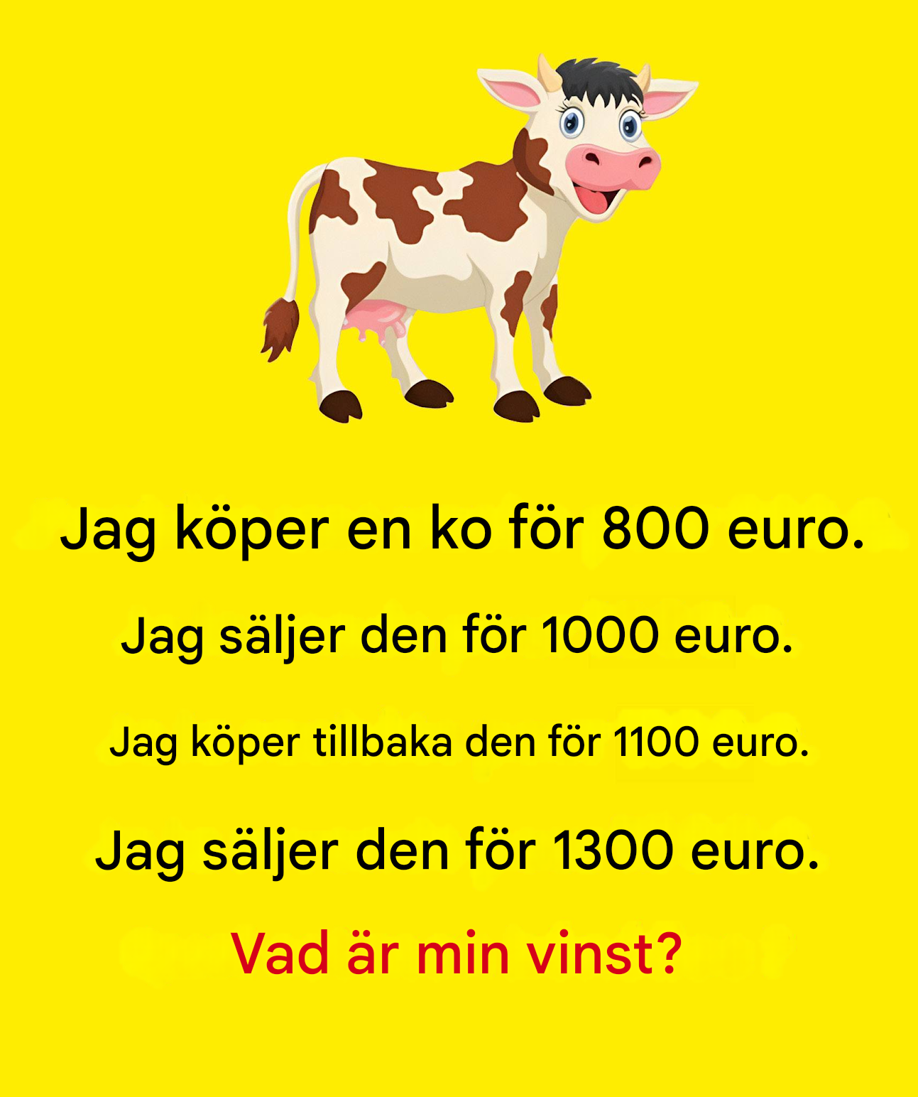 Du har förmodligen sett det här problemet förut: en ko köps och säljs, summor pengar byter ägare… och slutligen den knepiga frågan: "Hur mycket tjänade den?" Du tror att du vet, men när du räknar om blandas allt ihop. Oroa dig inte, det är inte så att du är dålig på matte: det är så att din hjärna blir distraherad av de stora siffrorna. De goda nyheterna? Med en mycket enkel metod blir svaret kristallklart.