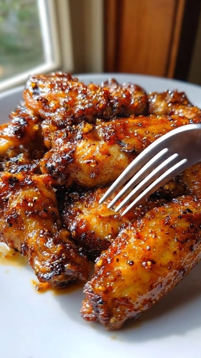 Beskrivning: "Titta på den där vackra glansen! Dessa kycklingvingar är först friterade tills de är perfekt krispiga och sedan täckta med en utsökt sås av honung, vitlök och en nypa chili. En smakexplosion som alla kommer att älska. Perfekt för en mysig kväll eller en grillfest!"