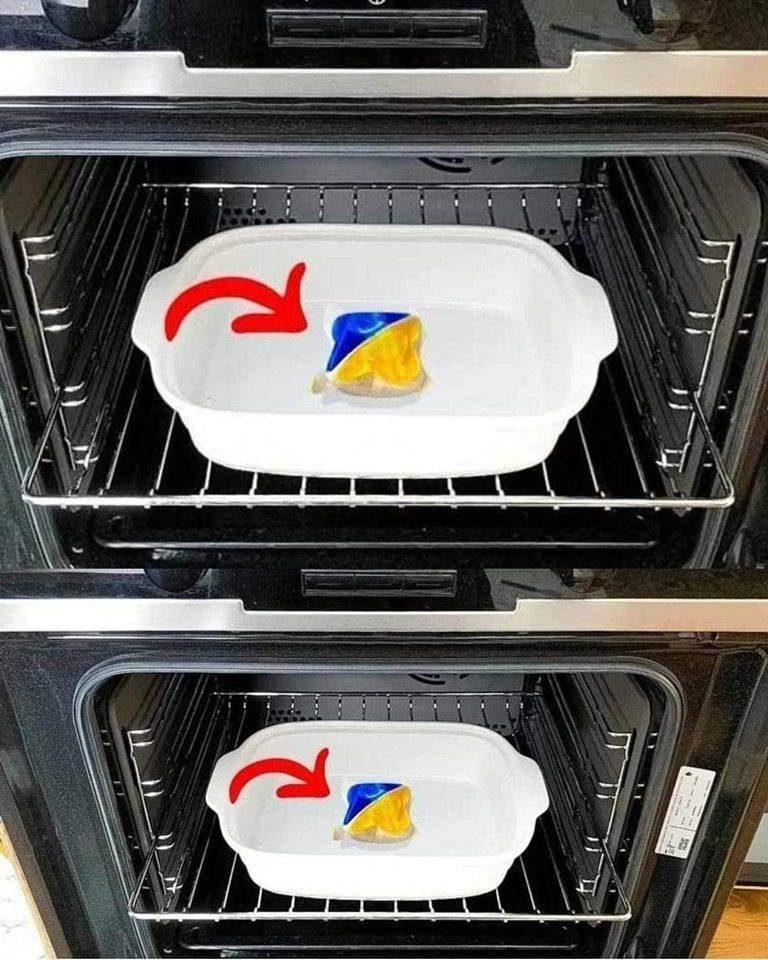 Tack vare sina avfettnings- och desinficerande egenskaper är diskmaskinstabletter fortfarande en effektiv rengöringslösning för ugnen. För att njuta av de många fördelarna, placera helt enkelt en kapsel på en bakplåt eller värmetålig form.