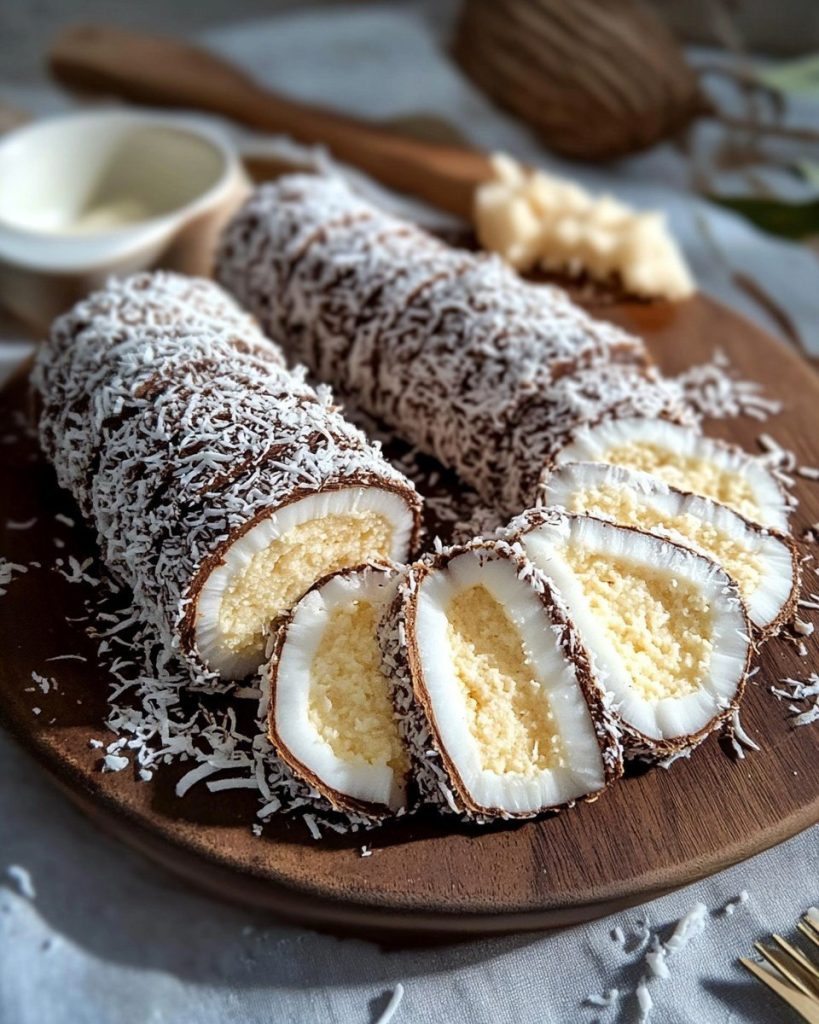 Kokosrullar med två krämer är en unik dessert som kombinerar kokosnötens delikatess med den intensiva smaken av två läckra krämer. Denna kombination gör varje lager av denna dessert till en sann njutning. Ett perfekt val för speciella tillfällen, fester eller helt enkelt för att lyfta humöret. Den krispiga skorpan, den delikata kokossmaken och den krämiga konsistensen gör att denna dessert garanterat kommer att bli en favorit i ditt hem.