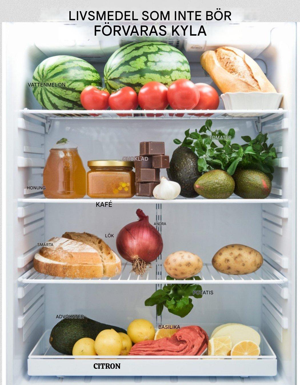 Livsmedel som aldrig ska förvaras i kylskåp Vissa livsmedel förlorar sin smak, konsistens eller kvalitet när de är kalla. Förvara i rumstemperatur för att njuta av dem till fullo! Frukter och grönsaker som är känsliga för kyla • Bananer: blir svarta och slutar mogna • Avokado: kylan hindrar dem från att mogna • Tomater: förlorar sin smak och blir mjöliga • Lök: mjuknar och möglar • Vitlök: blir seg och gror snabbt • Potatis och sötpotatis: stärkelsen omvandlas till socker • Squash och pumpor: förvaras bäst svalt, men inte i kylskåp Bröd och bakverk![]()