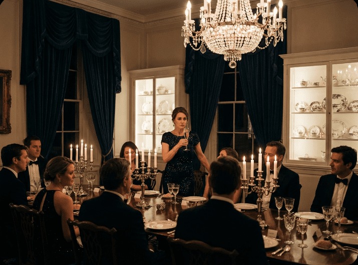 Safirrummet var mindre än jag hade föreställt mig. Taken var låga, de blå sammetsgardinerna hårt fördragna längs väggarna likt tunga teaterdraperier, som svalde ljud och ljus. Bordet glänste under en ljuskrona vars kristaller kastade splittrade reflektioner över glasen och besticken.