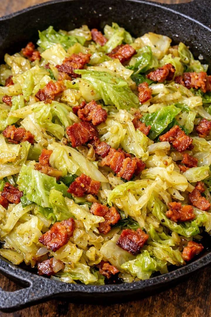 Servera denna stekta kål direkt ur gjutjärnspannan tillsammans med köttfärslimpa, stekt kyckling, bakade fläskkotletter eller en enkel stekt korv. Det är särskilt bra med majsbröd eller varma middagsrullar för att moppa upp bacon-y juicer. För en fylligare tallrik, tillsätt potatismos eller smörade äggnudlar och en enkel grön sallad. Det fungerar också vackert som en mysig brunch sida bredvid äggröra och rostat bröd.