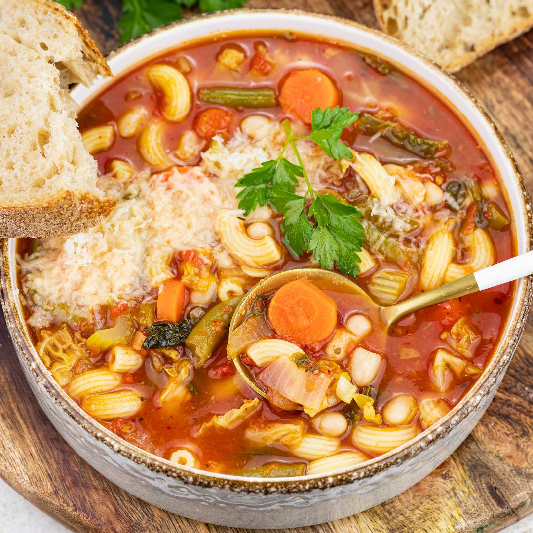 Den aromatiska och mättande italienska soppan Minestrone är ett recept du absolut måste känna till. Kolla in min favoritversion av denna unika grönsakssoppa, som jag serverar med pasta.