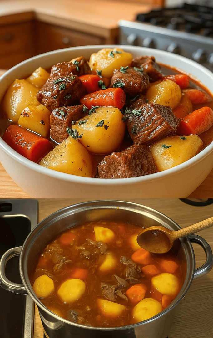 Skär nötköttet i vanliga tärningar. Rulla dem i mjöl, salt och peppar.