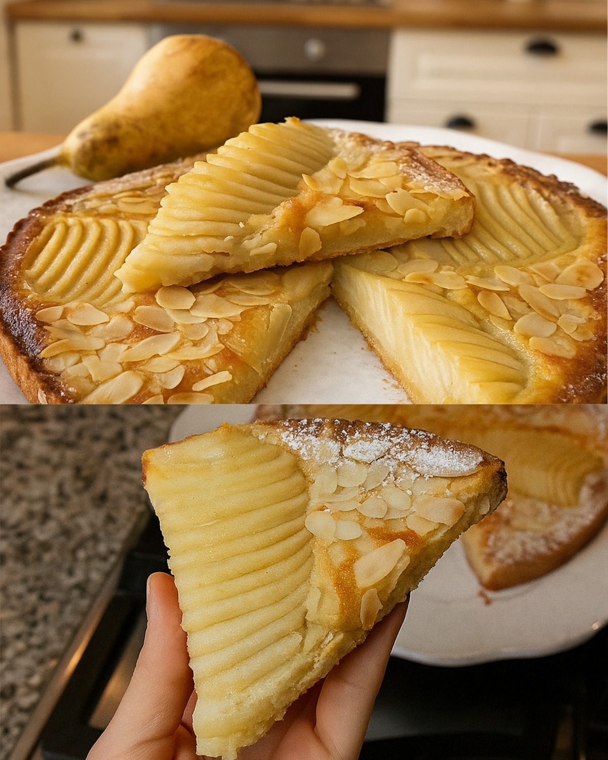 Skala och skiva päronen i tunna strimlor och lägg dem jämnt över grädden. Strö över flingad mandel.