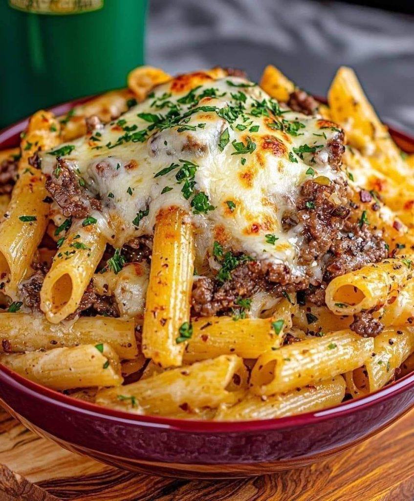 Här är ett utsökt recept på Philly Cheesesteak Pasta som kombinerar smakerna från en klassisk Philly cheesesteak-smörgås med pasta: