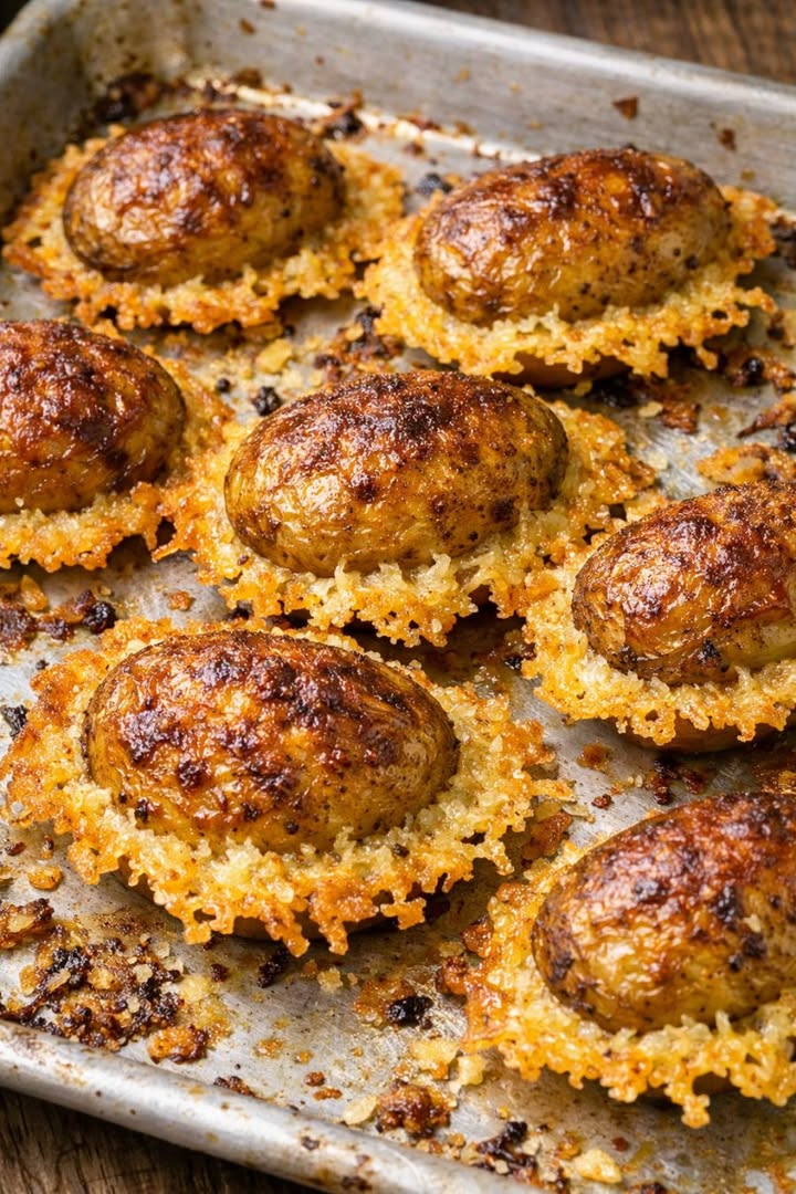 Dessa ugnsbakade potatishalvor med parmesanpanering och tre ingredienser är den typen av saker som försvinner innan steken ens når bordet. Min moster tog först med sig en kastrull av dessa till en stor familjesammankomst ute på gården, och vi stod runt köksön och poppade upp dem som godis tills bakplåten var ren. De är enkel mellanvästernkomfort rakt igenom: potatis från skafferiet, en rejäl näve salt ost och smör som gör det smör gör bäst. Magin ligger i hur parmesanen smälter till en spetsartad, gyllenbrun kjol på botten medan potatisen rostas mör inuti och krispig i kanterna.