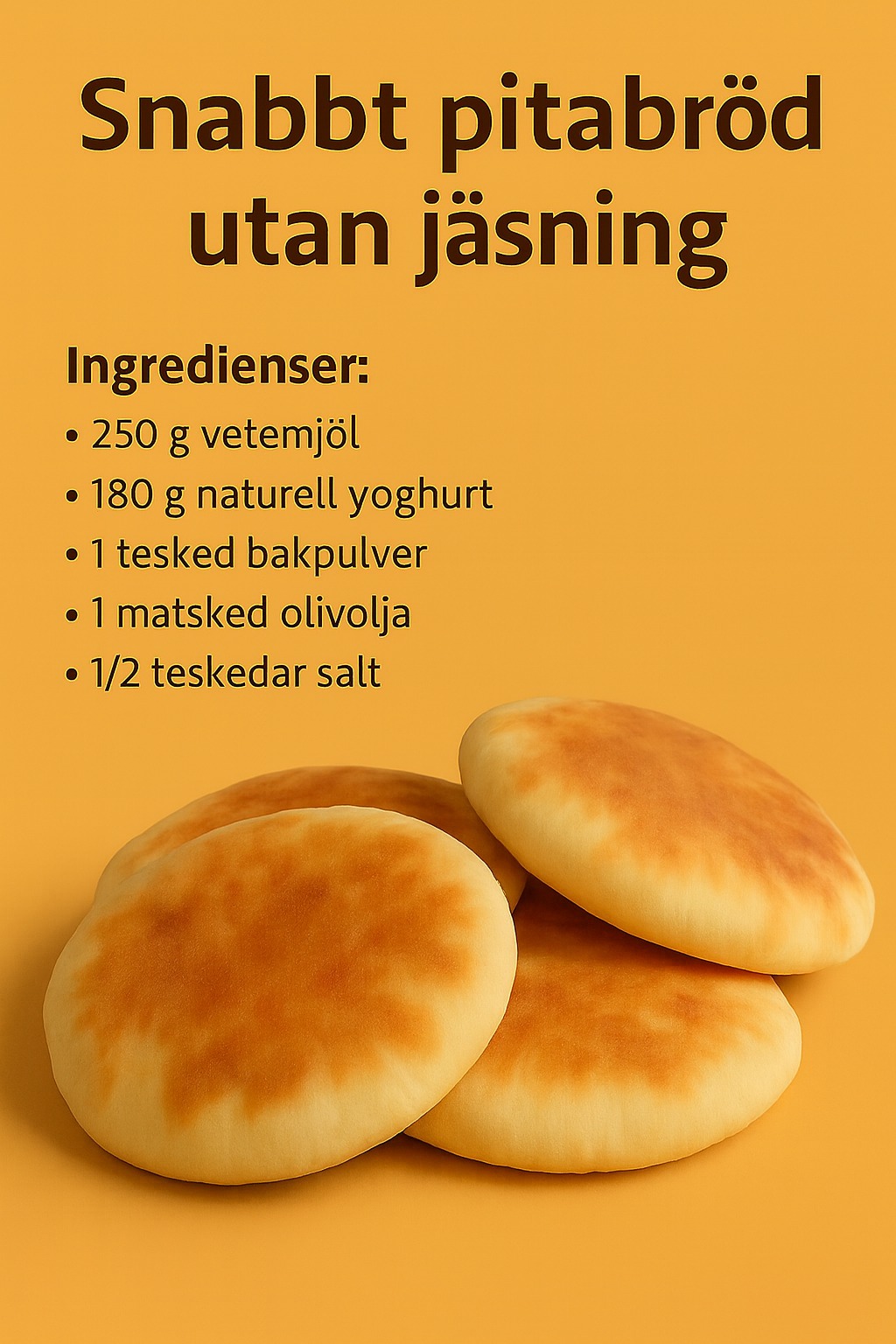 Du kan tillaga det hemma i en stekpanna eller i ugnen. Att tillaga degen kräver inte en stor mängd ingredienser. Degen tillagas utan jäst. Receptet passar om du inte har mycket tid. Du kan ha det färdiga pitabrödet till middag, lunch eller som mellanmål.