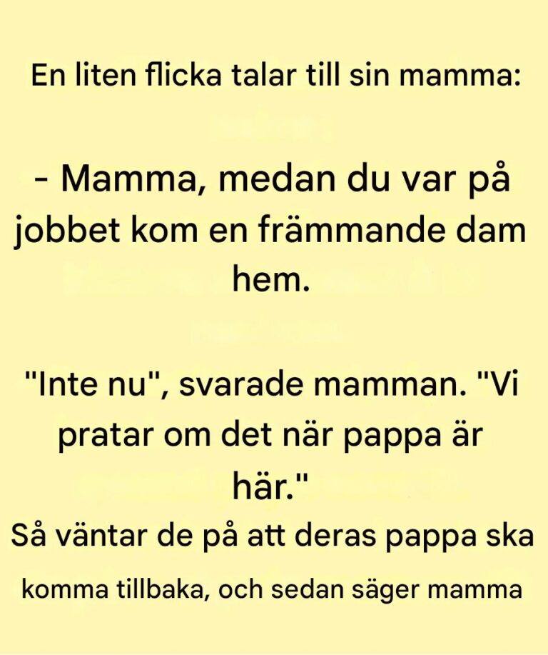 En oskyldig liten flicka sätter sig vid bordet och yttrar med ett busigt flin en mening som kommer att krossa hennes familjefrid: "Mamma, medan du var på jobbet kom en främmande dam till huset." Även om detta uttalande verkade harmlöst, döljer det faktiskt mycket mer än det ser ut. Mamma, uppslukade av sina sysslor, stelnar omedelbart till. En främmande dam? Detta omnämnande väcker misstankar, men mamma föredrar att skjuta upp diskussionen tills pappa kommer.