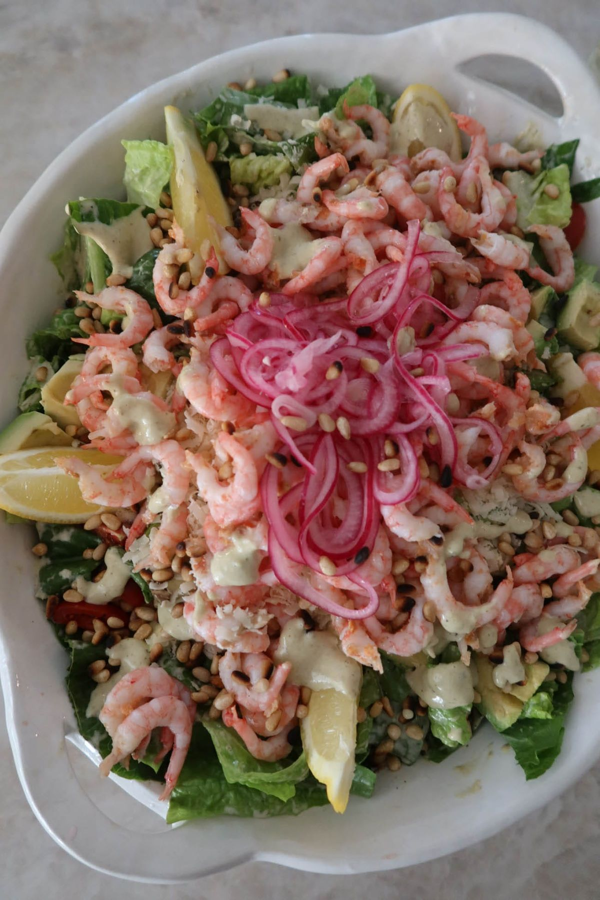 5. Ringla den krämiga citron-senapsdressingen jämnt över räkorna och grönsakerna.