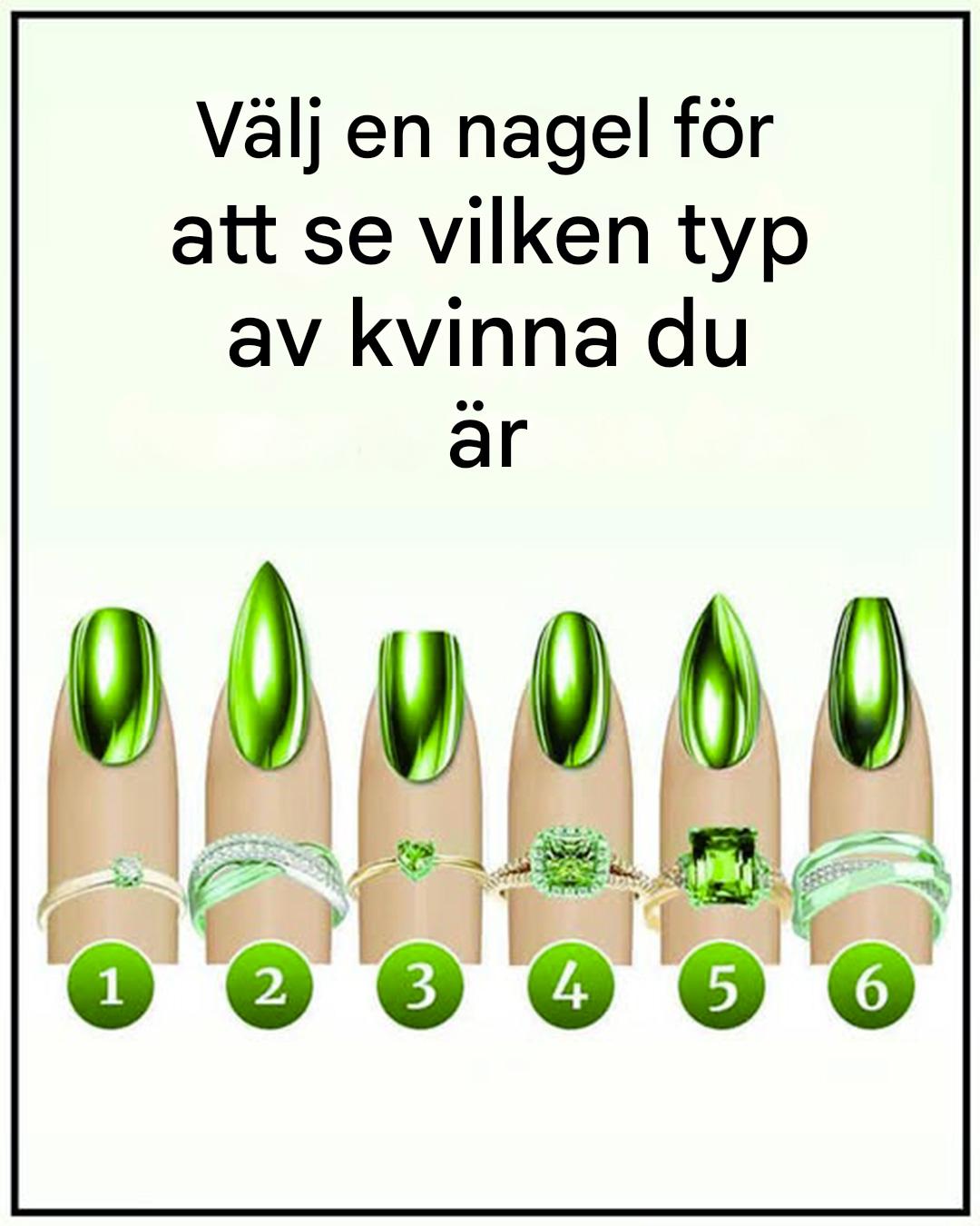 Din nagelstil säger mycket om dig. Ja, du läste rätt! Genom att helt enkelt observera en nagelform som spontant attraherar dig kan detta unika personlighetstest positivt överraska dig. Välj den som tilltalar dig mest bland de sex formerna nedan ... och upptäck vad den avslöjar om dina styrkor, dina svagheter och vad som verkligen är viktigt för dig i livet.