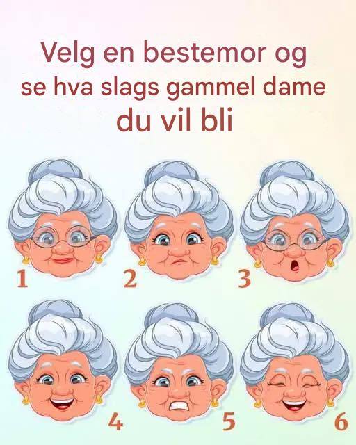 Aldring är en resa full av visdom, erfarenheter och, la oss vara ärliga – roliga særegenheter. Enten vi gillar det eller inte, forvandlar vi oss alla när vi blir äldre, och utvecklare unika trekk som definierar våra gylne år. Detta lekne motiv utforskar dig för att välja en bästamor och upptäcka vad slags äldre kvinna du kan bli. Så, hvilken taler til ditt framtida jeg? La oss finne det ut!
